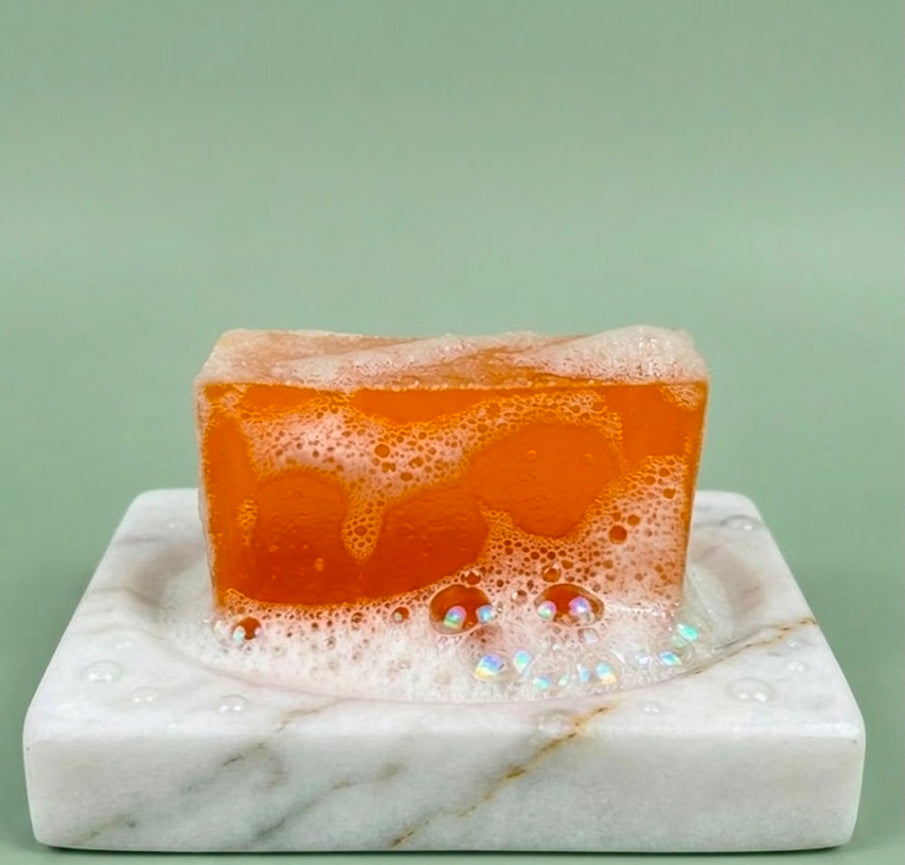 Using your fingertips, gently massage the soap onto your skin in a circular motion. Focus on areas with dark spots, acne, blemishes, or hyperpigmentation. Be careful around the eye area.
